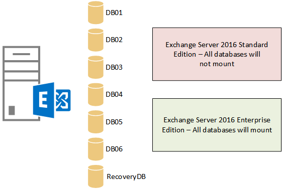 - Exchange Server 2016 Enterprise Edition – maximum of 100 mounted databases per server